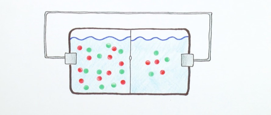 Las propiedades de la membrana sólo permiten que los iones con carga positiva pasen a través , dejando a los iones cargados negativamente donde están y la creación de un entorno para crear tension entre las dos células. La transferencia de los iones establece una corriente, que está ayudado por la tensión en el sistema.